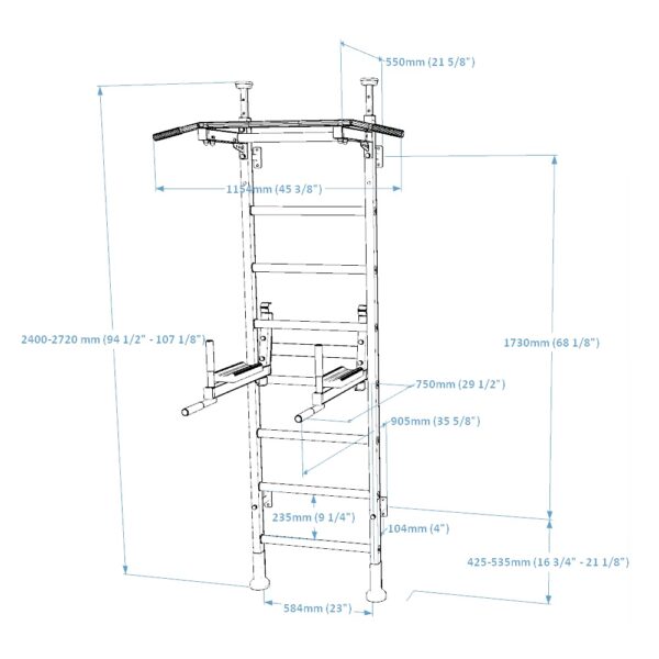 Drabinka gimnastyczna BenchK montowana rozporowo podłoga-sufit lub do ściany z metalowym drążkiem do podciągania montowanym na stałe z dwoma uchwytami oraz poręczami do ćwiczeń, które mogą służyć również jako uchwyt pod sztangę.