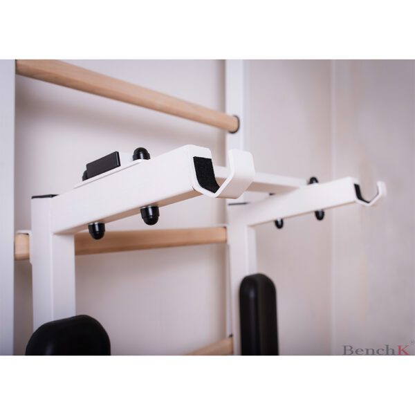 Poręcze BenchK DB0W mają dwie różne funkcje. Można ich użyć do wykonywania ćwiczeń mięśni brzucha, takich jak unoszenie nóg w podporze, poprzez założenie ich za szczebel drabinki, jak pokazano na stronie 7 instrukcji. Można też odwrócić poręcze i zawiesić je na szczeblach drabinki za pomocą dwóch haków, jak pokazano na stronie 8 instrukcji, aby służyły jako uchwyt na sztangę. Haki posiadają podkład z filcu o grubości 4 mm, aby zapobiec porysowaniu drewnianych szczebelków drabinki.