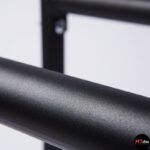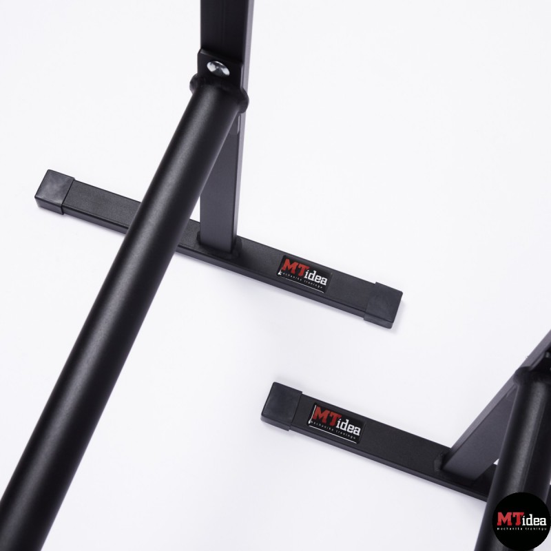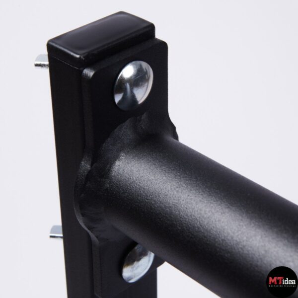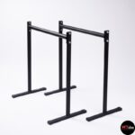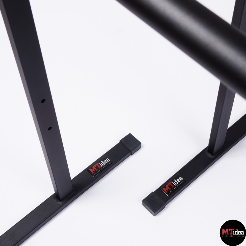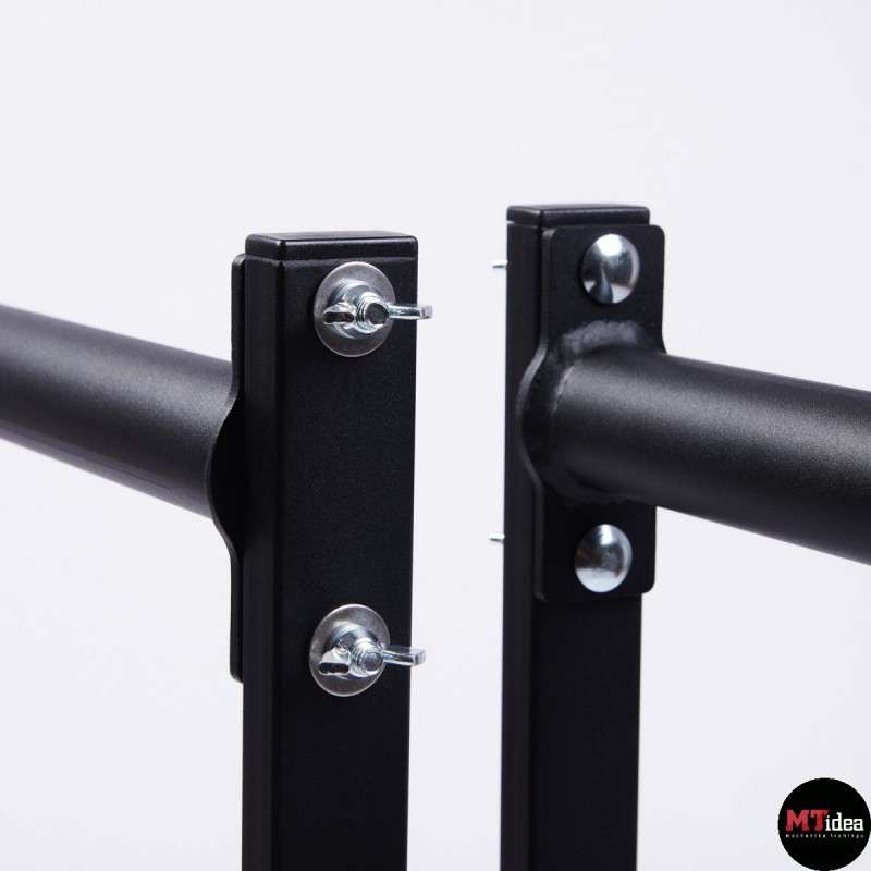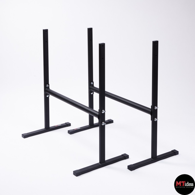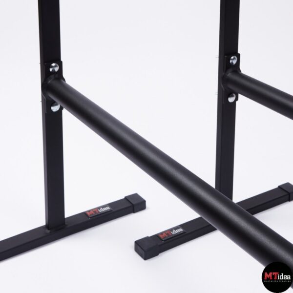 Stabilne poręcze wykonane zostały z malowanej proszkowo stali. Poręcze posiadają możliwość regulacji wysokości drążka od 30 cm do maksymalnego poziomu 84 cm. Wysokość 84 cm jest odpowiednia dla osób o wzroście powyżej 185 cm i umożliwia wykonywanie zaawansowanych elementów, takich jak front lever, back lever, czy hefesto. Każda noga została wyposażona w antypoślizgowe gumowane stopki, a drążki posiadają optymalną średnicę wynoszącą 42,4mm oraz malowaną strukturę tarciową, co zapewnia wygodne i stabilne uchwyty. Ten przyrząd jest szczególnie polecany do treningu gimnastycznego, kalistenicznego oraz do użytku domowego, ponieważ gwarantuje odpowiednią stabilność, sztywność i bezpieczeństwo.
